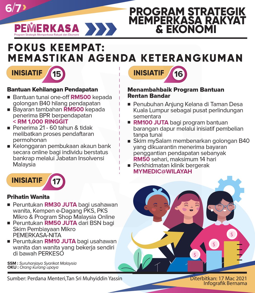 SKIM PEMBIAYAAN MIKRO PEMERKASA-NITA. Perdana Menteri berkata kerajaan juga bersetuju memberi bantuan tunai sekali bayar sebanyak RM500 kepada golongan B40 yang kehilangan pendapatan.