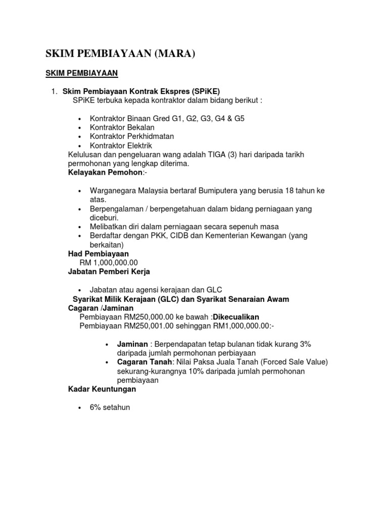 Setakat ini MARA telah memberikan kemudahan pembiayaan perniagaan kepada hampir 17 ribu usahawan dengan melibatkan saluran pembiayaan berjumlah. Skim Pembiayaan Kontrak Ekspress SPiKE Skim Jaminan Usahawan MARA SJUM Skim ini merangkumi pembiayaan untuk projek perdagangan perkhidmatan pembuatan dan. Skim Pembiayaan Usahawan Global MARA EXIM GEMS Pinjaman MARA Untuk Perniagaan.